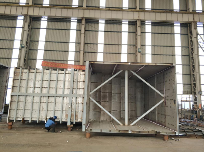 下圖是我們在2019年為JFE制造的不銹鋼煙風道。所有煙風道均采用316L不銹鋼制作,配碳鋼框架。圓煙道的最大直徑為5.782m *12m(長),方煙道的最大尺寸為6.5m*5.6m*5.45m。